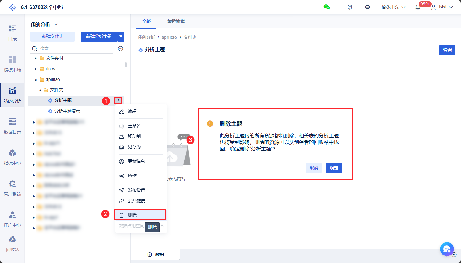 注:若分析主题内有已发布的数据集或仪表板时无法删除。