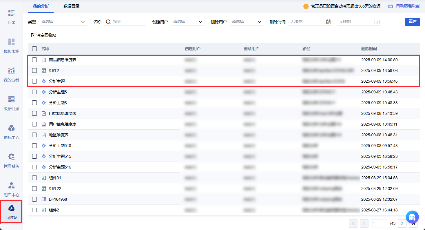 删除后主题内的组件、仪表板、数据表可在回收站中找回。如下图所示: