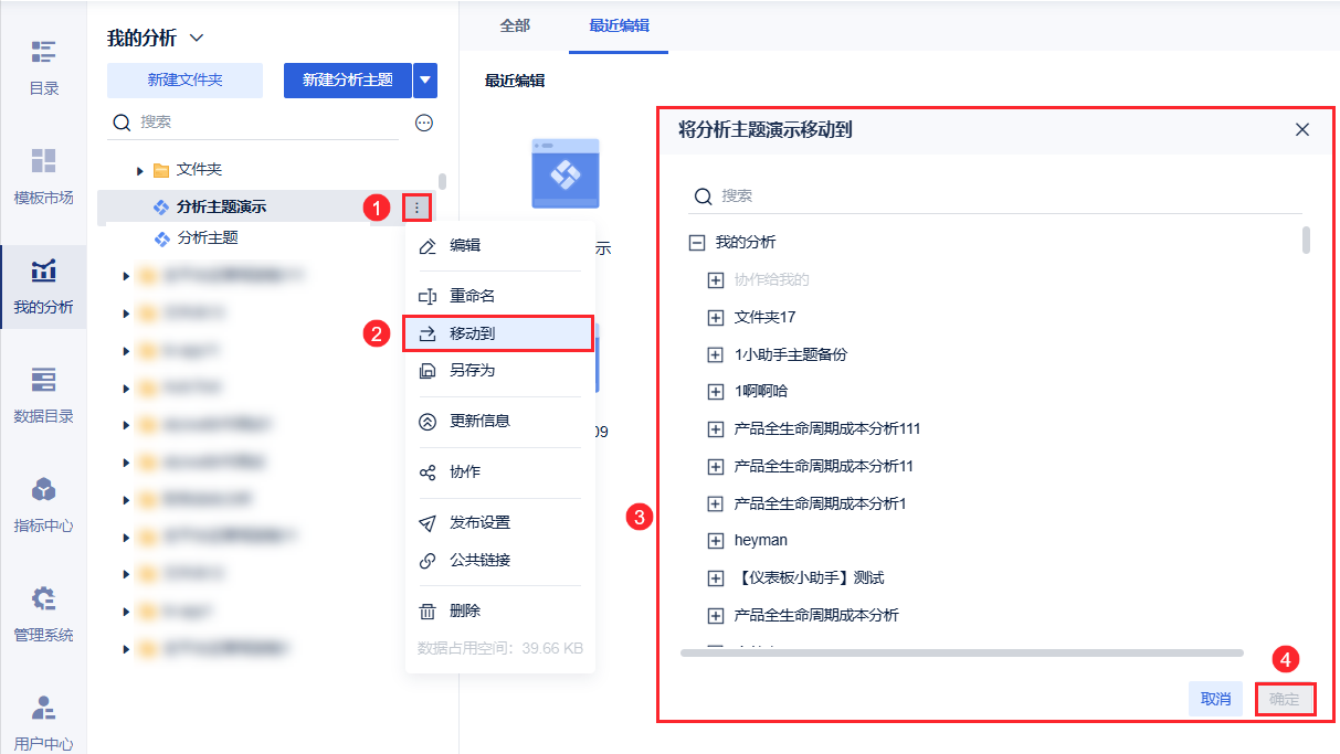 点击「...>移动到」,即可将分析主题移动到文件夹对应位置,点击「确定」,如下图所示: