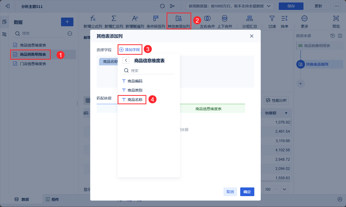 1)我们就需要将「商品名称」添加到当前表。点击「添加字段」,选择「商品信息维度表」中的「商品名称」。如下图所示: