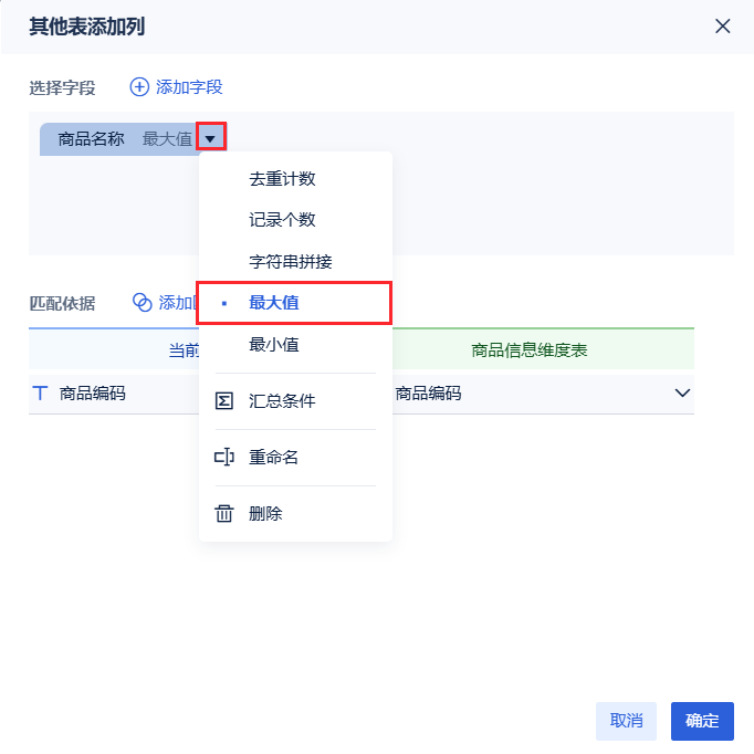 当前表与「商品信息维度表」都拥有「商品编码」字段,且该字段具有辨识度。我们添加此字段作为匹配依据,如下图所示: