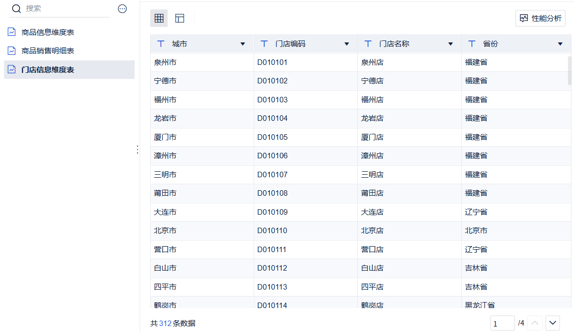 创建分析主题,并添加示例数据「门店信息维度表、商品信息维度表、商品销售明细表」