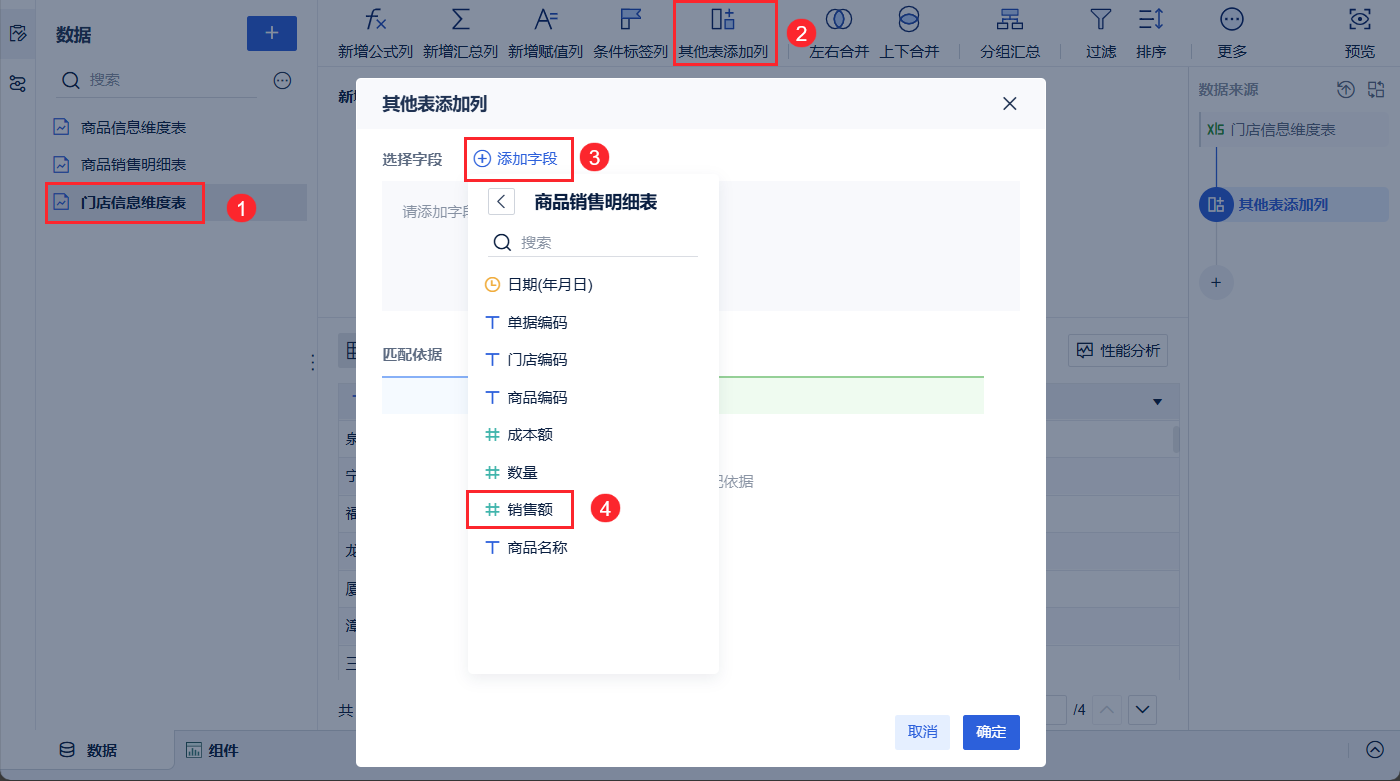 1)点击「其他表添加列」,将「商品销售明细表」中的销售额添加进来。如下图所示: