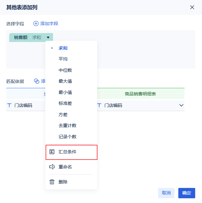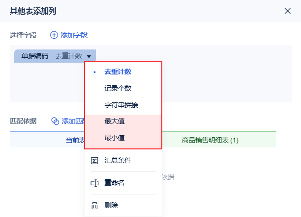 添加字段和合并表若有关联字段,会自动添加合并依据;也支持手动添加合并依据