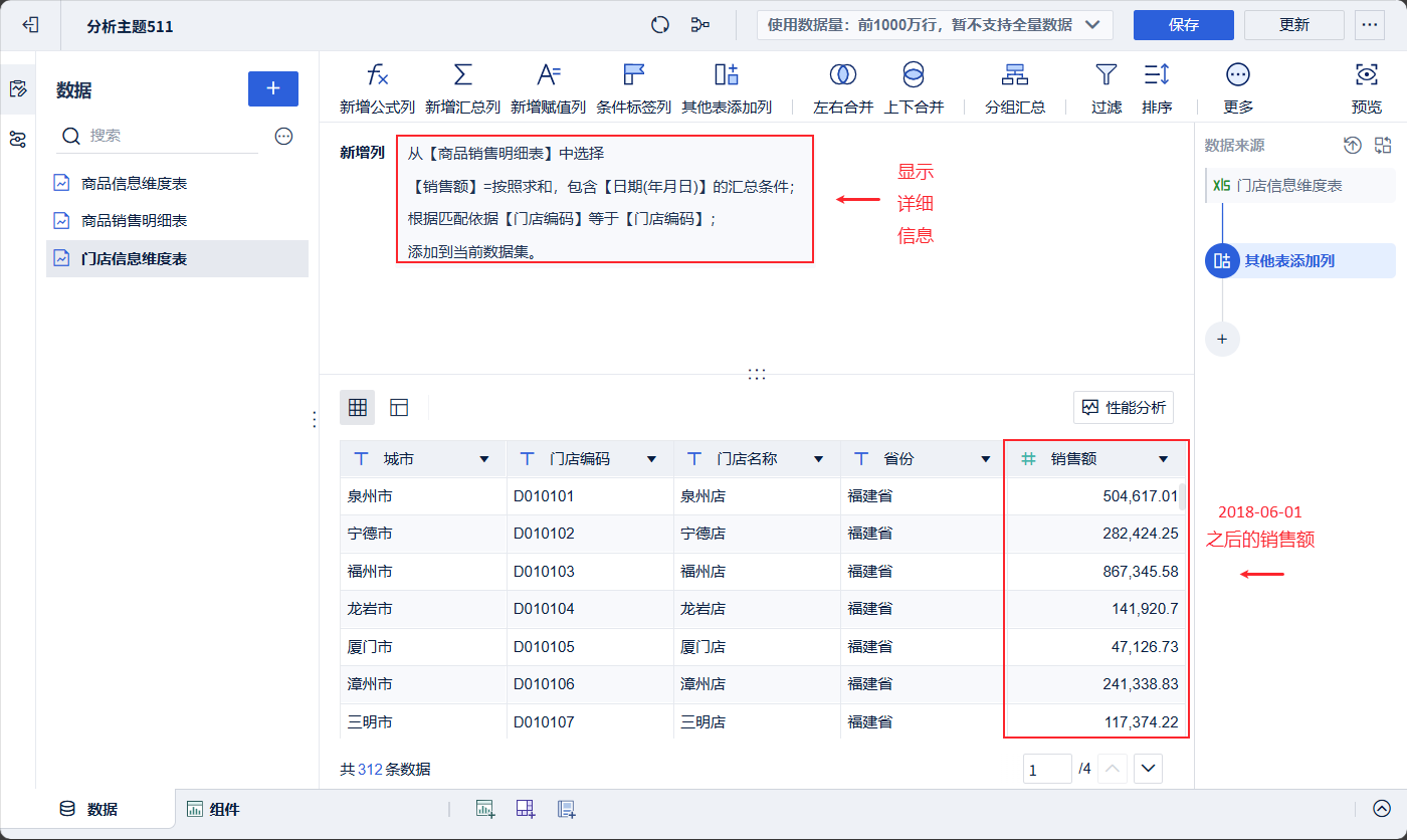 门店信息维度表包含了门店的基础信息。如果想知道每个门店的销售额,使用其他表新增列该如何做?