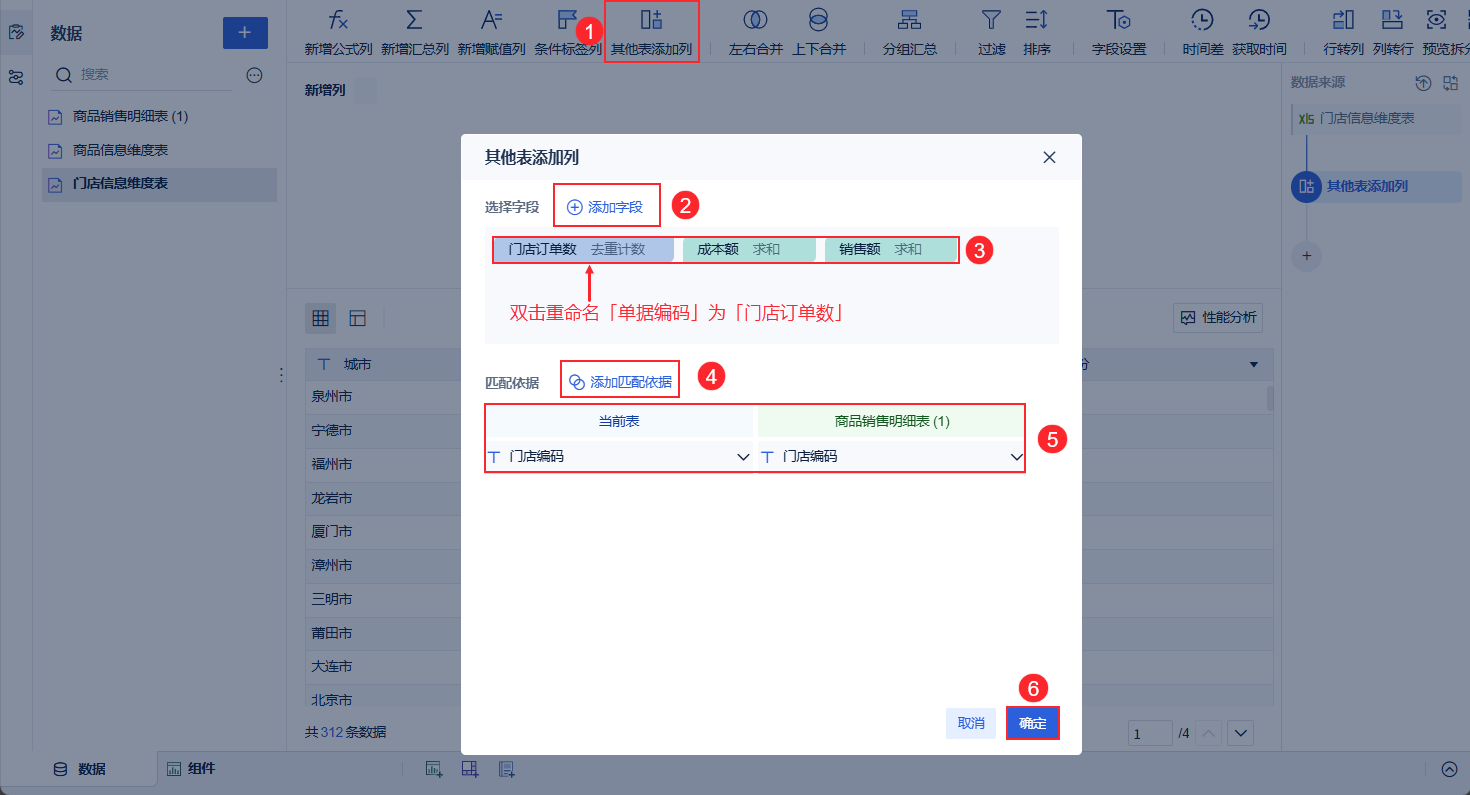 我们也可以对「门店信息维度表」添加步骤「其他表添加列」。添加「商品销售明细表」字段,计算每个门店订单数、成本额、销售额。以「门店编码」作为合并依据。操作如下图所示: