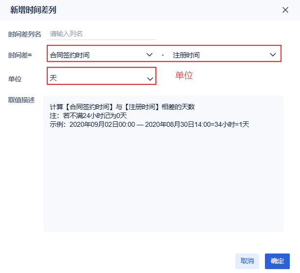 2)新增列「时间差」,计算合同签约时间 -注册时间,单位选择「天」,如下图所示: