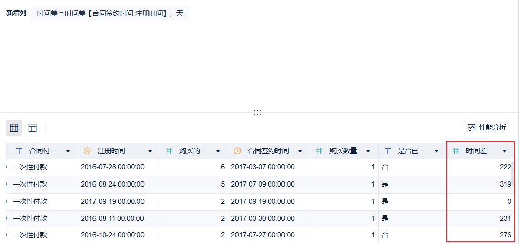 表中已有字段「注册时间」和「签约时间」。如何知道客户注册时间和签约时间相差多少天呢?