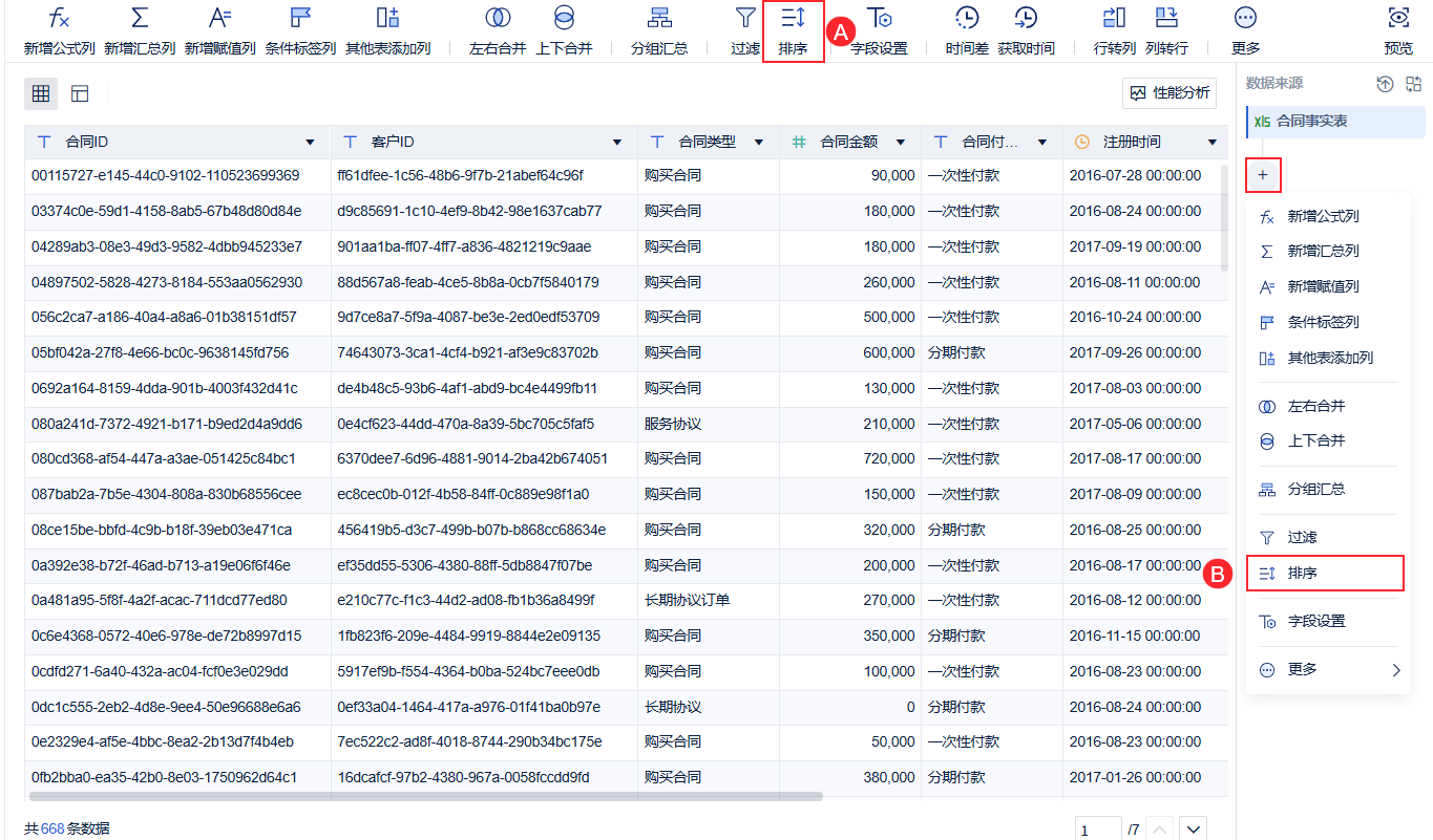 排序入口可以直接点击顶部「排序」;或者点击右侧「+>排序」。如下图所示: