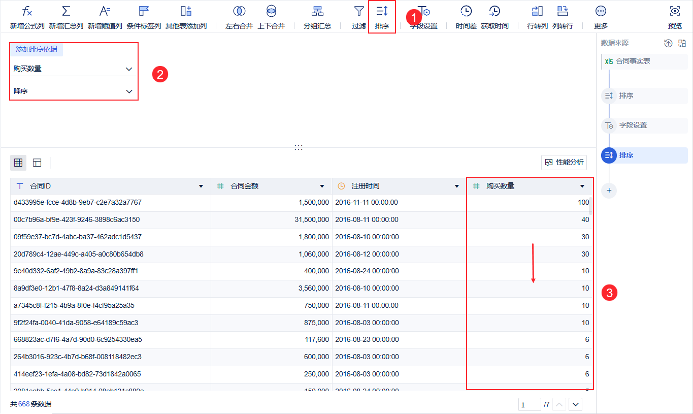2)添加「排序列」,选择「购买数量」进行降序排列,数据即按照购买数量由大到小进行排序,如下图所示: