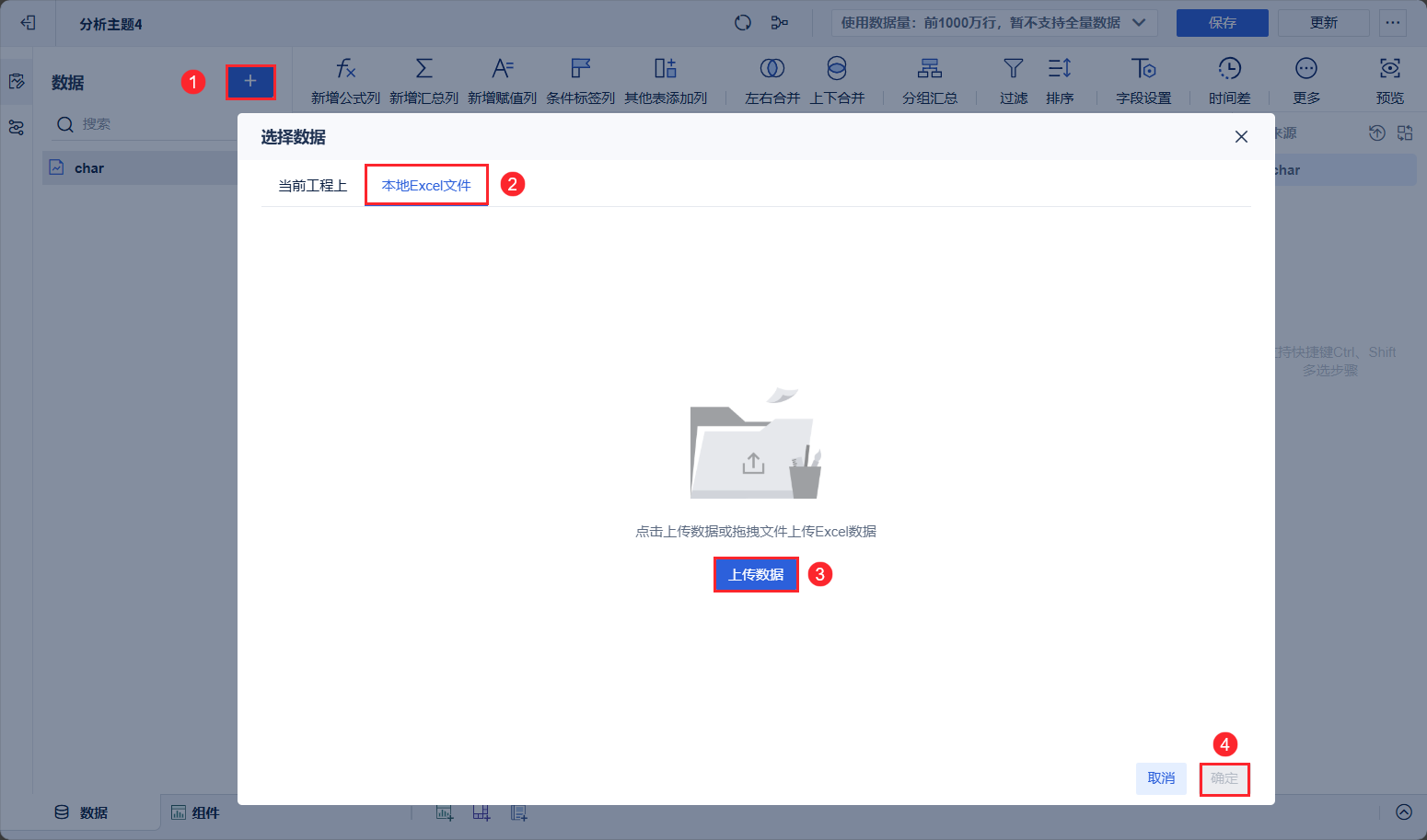 新建分析主题,添加下载的示例数据将示例数据「char」,默认全选字段,如下图所示: