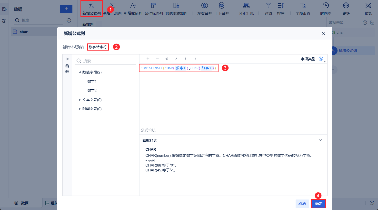 添加「新增公式列」,命名字段名称为「数字转字符」,输入函数CONCATENATE(CHAR(数字1),CHAR(数字2)),点击「确定」,如下图所示: