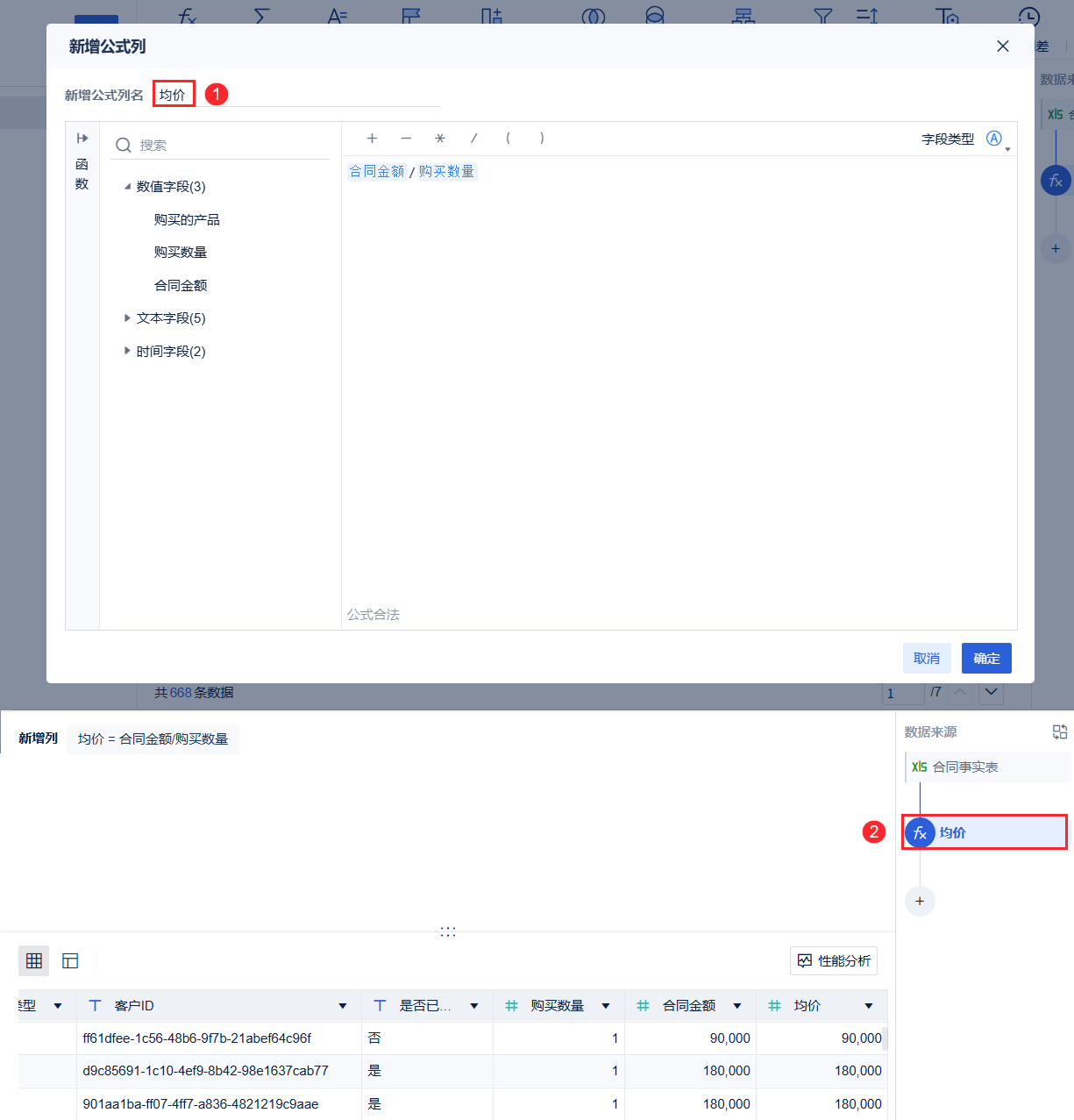 例如,上述示例新增公式列名为「均价」,后修改右侧步骤名称为「合同均价」,则公式列名不发生变化。