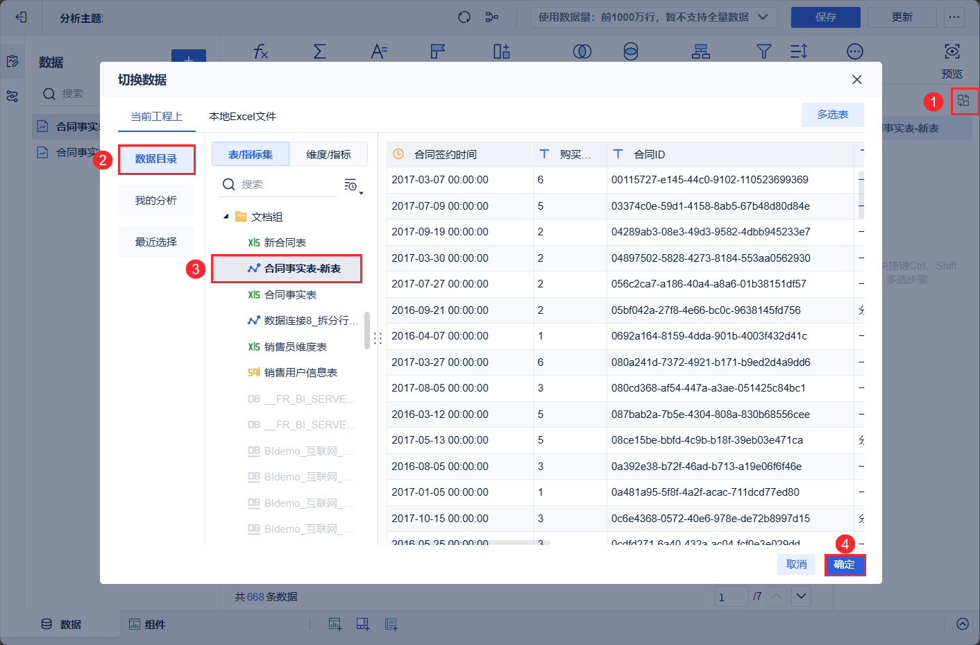 在分析主题的数据编辑界面,选择数据并「切换数据」来源。如下图所示: