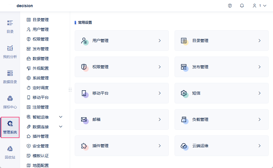 管理系统,是指管理员或次级管理员进入 FineBI 系统后,点击管理系统,可对整个平台进行管理的设置区域,如下图所示: