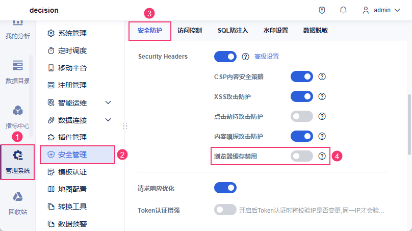 管理员进入 FineBI 系统,点击「管理系统>安全管理>高级设置」,关闭「浏览器缓存禁用」按钮。如下图所示: