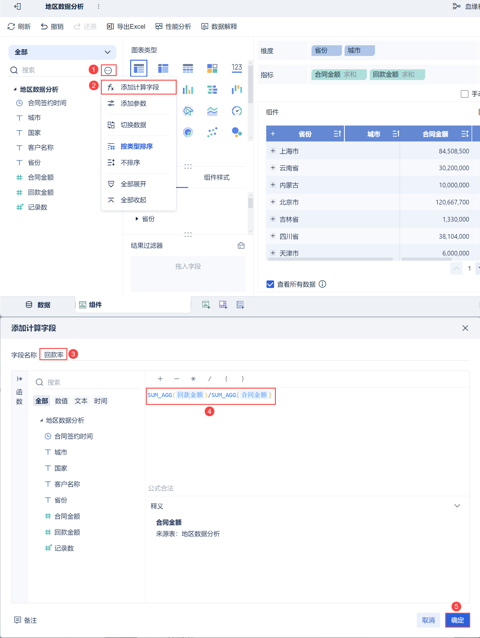 3)添加「回款率」计算公式:SUM_AGG(回款金额)/SUM_AGG(合同金额)