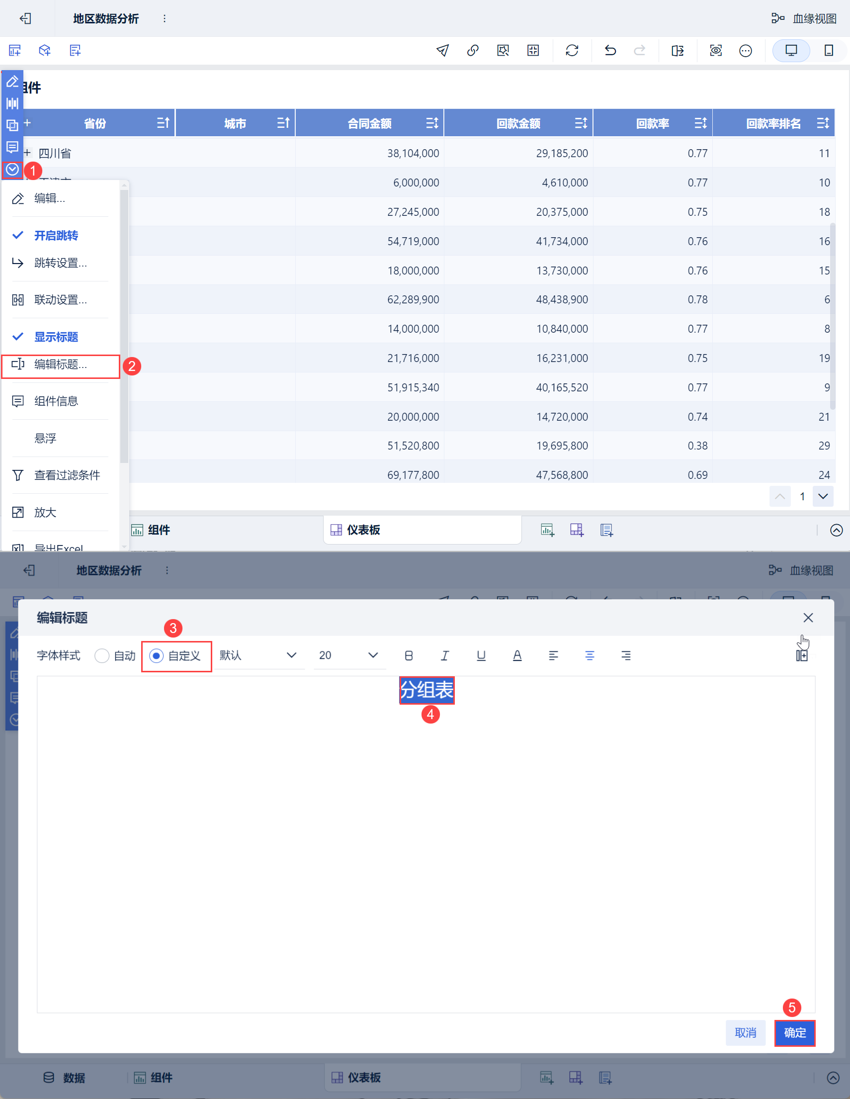 3)下拉选择「编辑标题」,样式选择「自定义」,设置标题为「分组表」,点击「确定」。如下图所示: