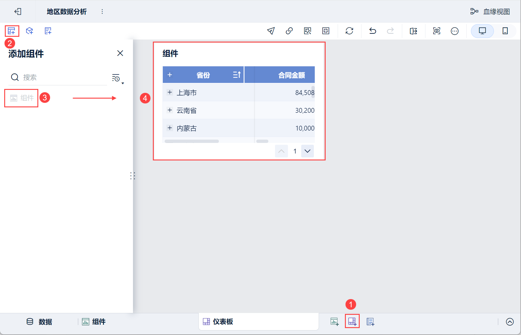 2)进入仪表板编辑界面,将分组表组件拖入至仪表板中。