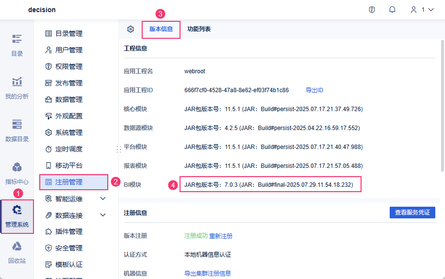 管理员登录FineBI系统,点击「管理系统>注册管理>版本信息」,即可查看工程的版本号。