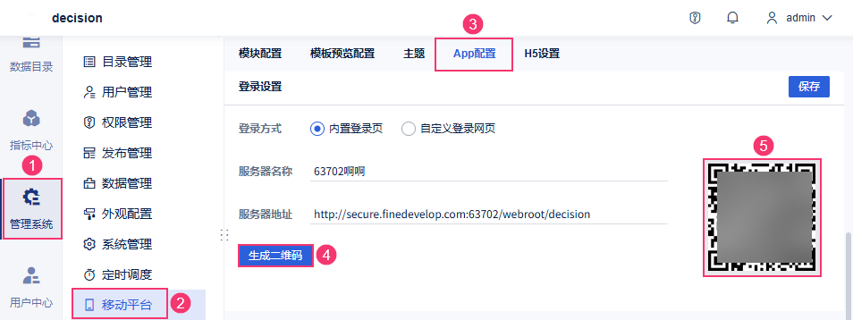 管理系统>移动平台>App配置>登录设置中生成了二维码,如下图所示: