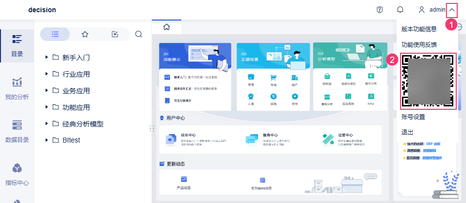 用户登录 FineBI 系统后,点击左上角用户名,即跳出该二维码。