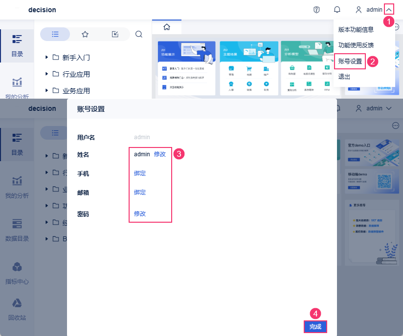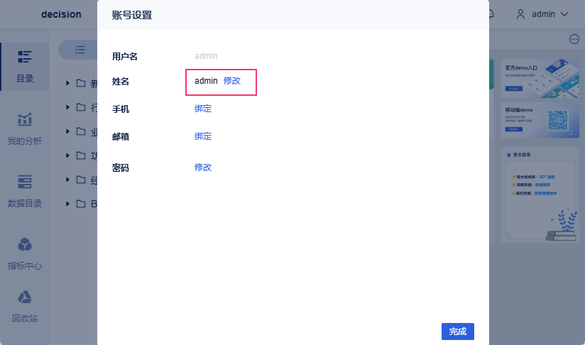 符合条件的用户登录FineBI系统后,点击右上角的用户名,点击「账号设置」,可修改用户的姓名、密码、绑定邮箱、绑定手机。如下图所示: