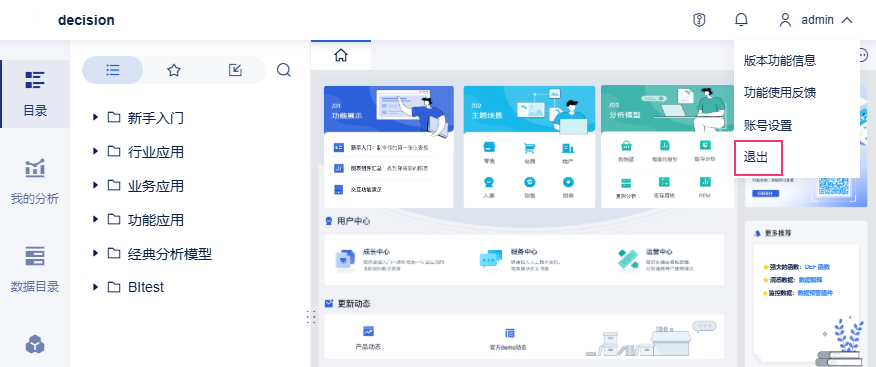 点击FineBI系统右上角用户名,点击「退出」按钮,用户登出FineBI系统,直接跳转至登录页面,如下图所示: