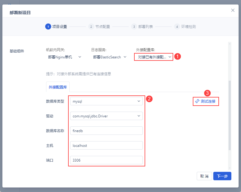 在「部署新项目-项目设置」时,可接入自备的MySQL数据库作为工程配置库。