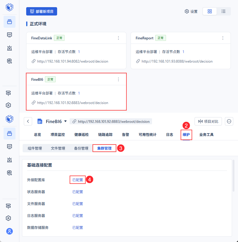 1)管理员登录运维平台,选中指定项目。点击「维护>集群管理」,对「外接配置库」进行配置。