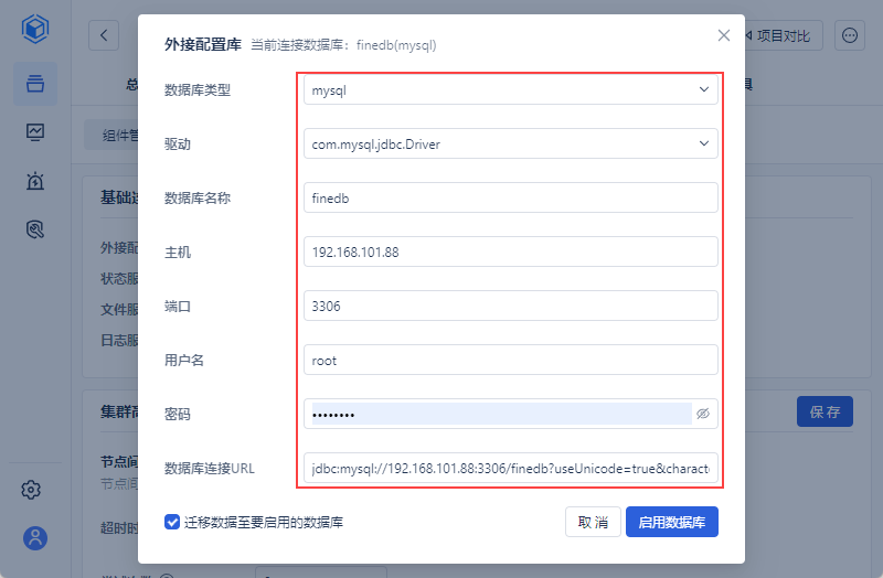 希望使用其他项目配置 (例如将正式环境配置,拷贝一份给测试环境使用) | 1)自行将准备的配置数据上传到新Mysql表空间中 必须确保所准备的数据,对应的项目 JAR 包版本和当前项目的 JAR 包版本完全一致,否则无法使用 2)不勾选「迁移数据至要启用的数据库」 3)项目与该配置库对接成功后,会使用表空间中的数据,作为项目的配置 4)项目原有配置的对接信息,会备份到工程config目录下的db.properties.bak文件中 |