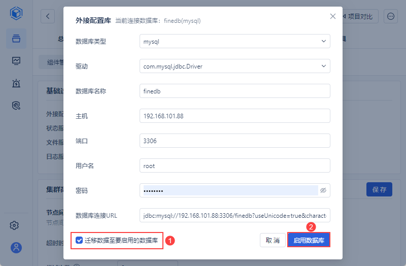 | 希望使用当前项目原有配置 | 1)必须勾选「迁移数据至要启用的数据库」 2)项目与该配置库对接成功后,会将工程原有配置数据,迁移到该表空间中 3)无论准备的新Mysql表空间中是否有数据,均会被清空,无法找回 |