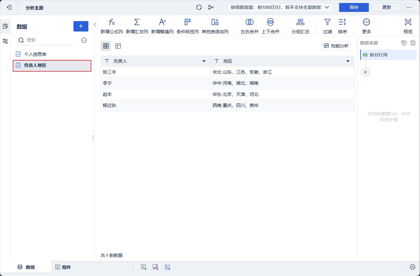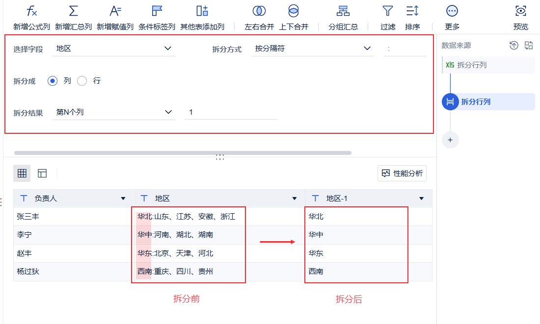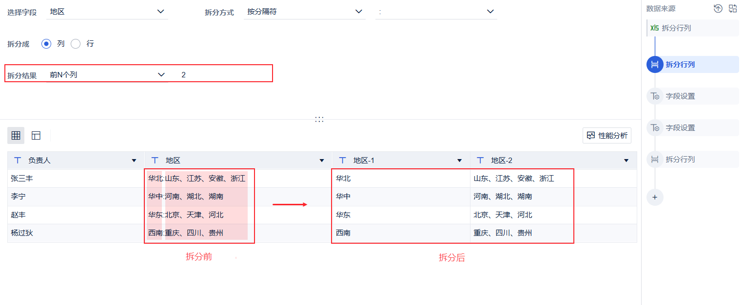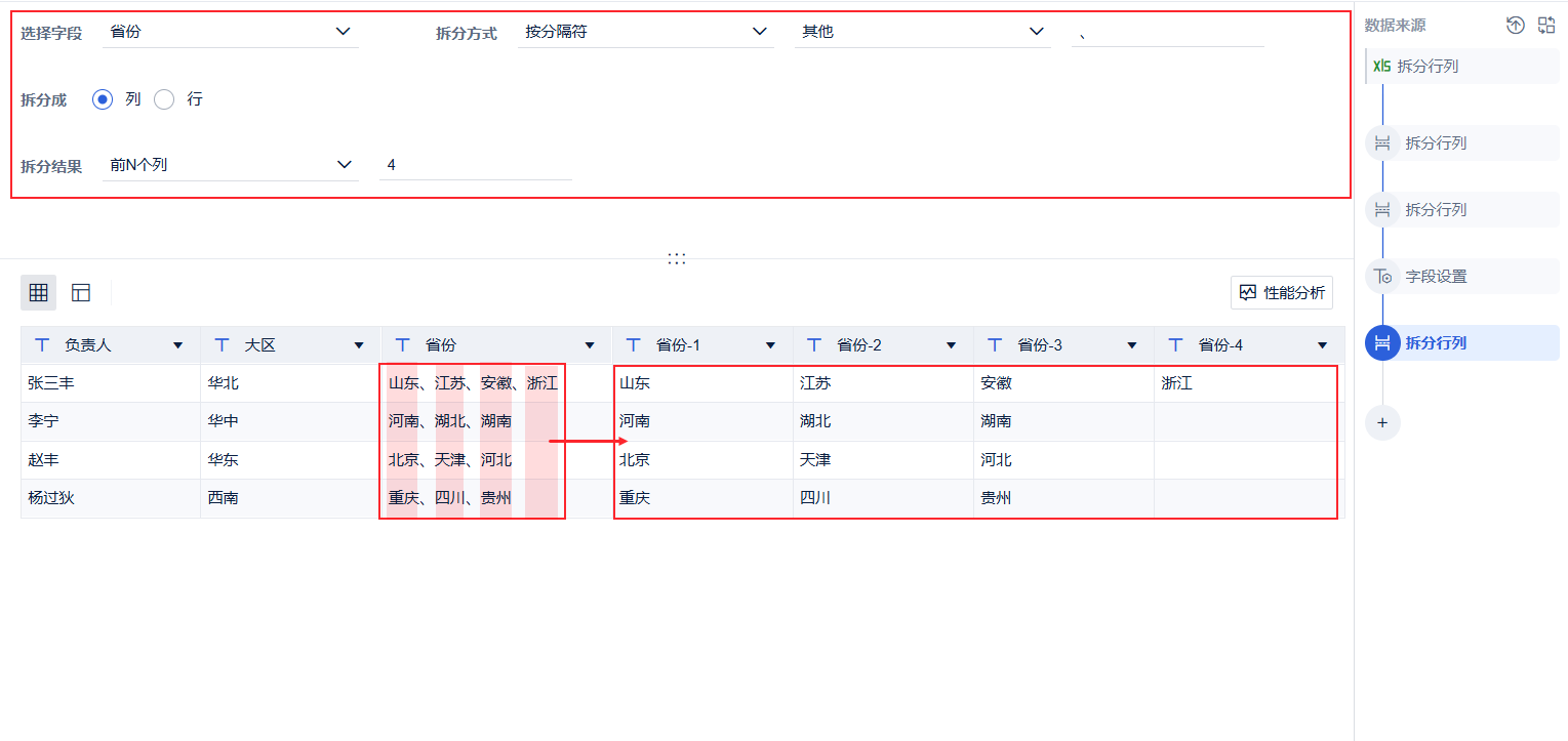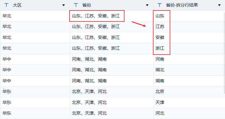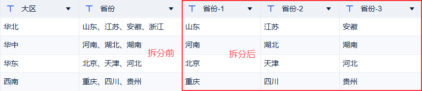 这里我们可以通过字段设置,删除原字段,并将拆分后的字段命名为「大区」和「省份」,如下图所示: