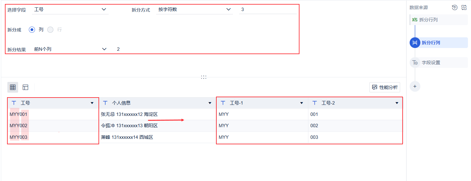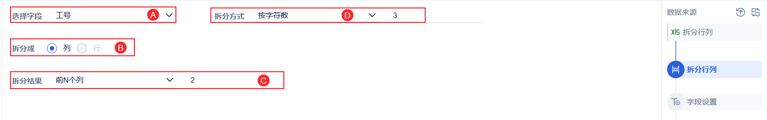 • 按字符数拆分:「中国江苏无锡」一共 6 个字符,以 2 个字符拆分,可拆分为「中国」「江苏」「无锡」三个字段值