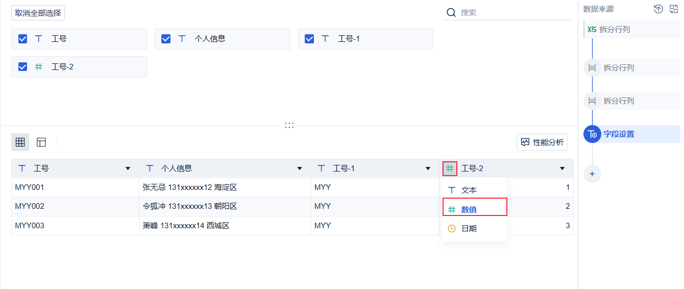 2)将数字部分的字段改为「数值格式」,如下图所示,如此便方便进行对比和排序了。