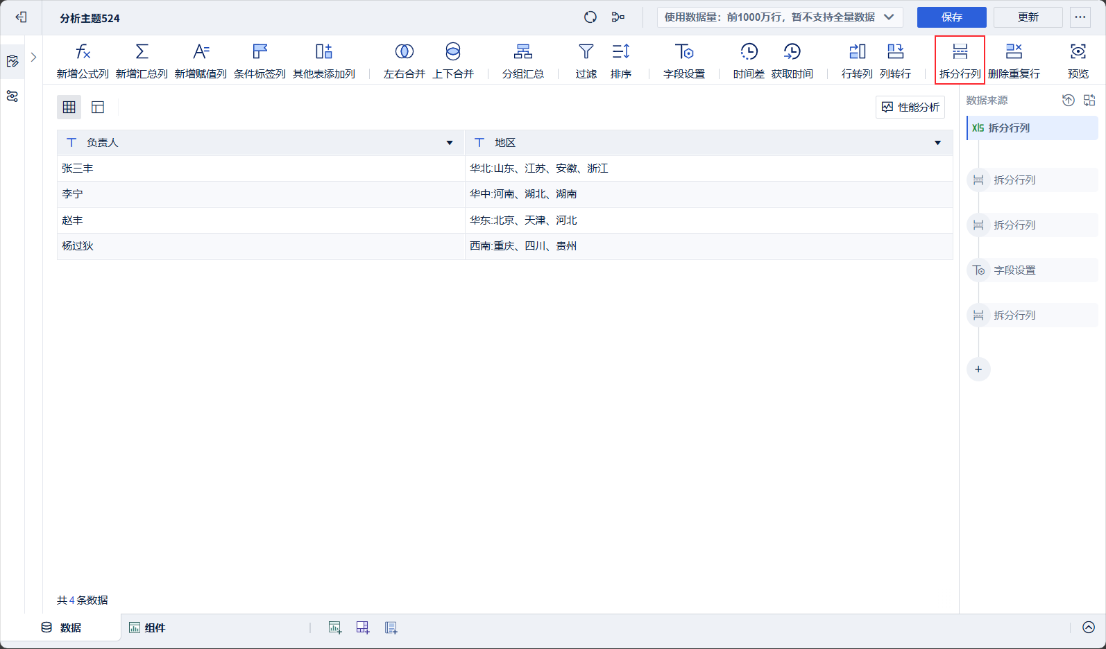 1)在数据编辑界面点击「拆分行列」,进入功能界面,如下图所示:-