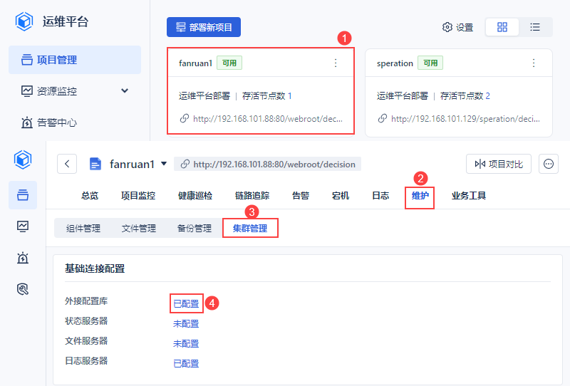 2)点击「维护>集群管理」,对「外接配置库」进行配置。