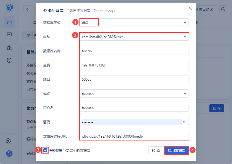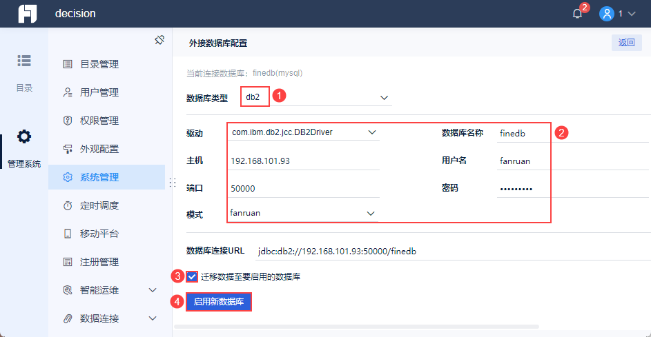在正式环境下,用户可准备一个DB2数据库,与帆软应用对接,用于配置存储。稳定的外部数据库,可确保帆软应用在高负载下的稳定运行。