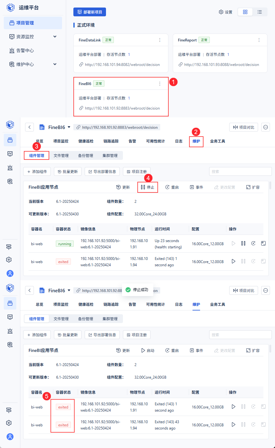 请对「bi-web」组件进行一键「停止」,确保所有「bi-web」容器关停至「exited」状态。