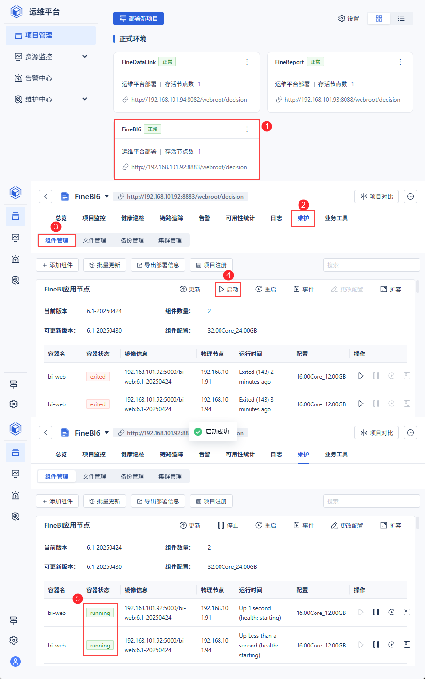 请对「bi-web」组件进行一键「启动」,确保所有「bi-web」容器启动至「running」状态。