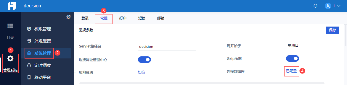1)管理员登录帆软应用,点击「管理系统>管理系统>常规」。