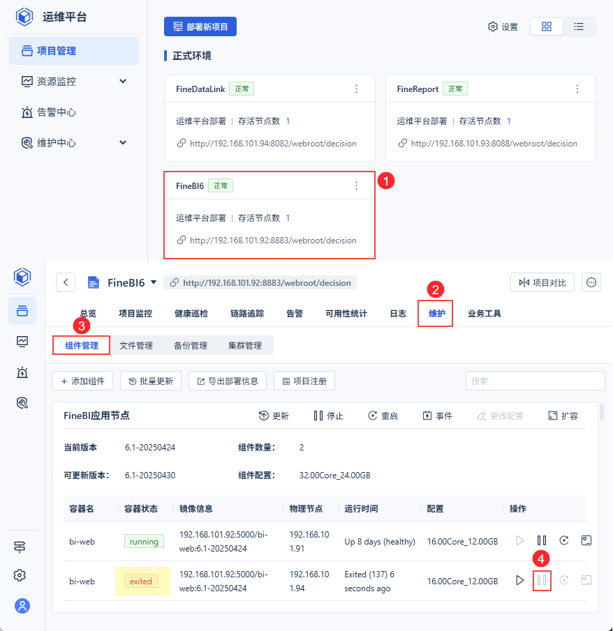 管理员登录运维平台,选中指定项目。点击「维护>组件管理」。检查是否有多个「bi-web」容器存活。