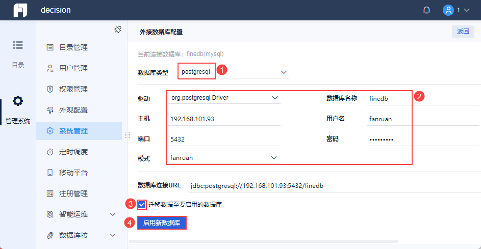 在帆软应用的「管理系统>管理系统>常规」中,可接入自备的数据库作为配置库。