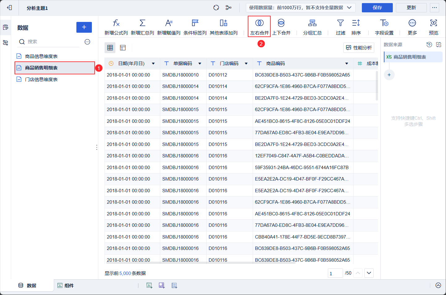 右侧出现了新步骤「左右合并」,「商品销售明细表」的最右侧新增了蓝色的「商品信息维度表」的字段。