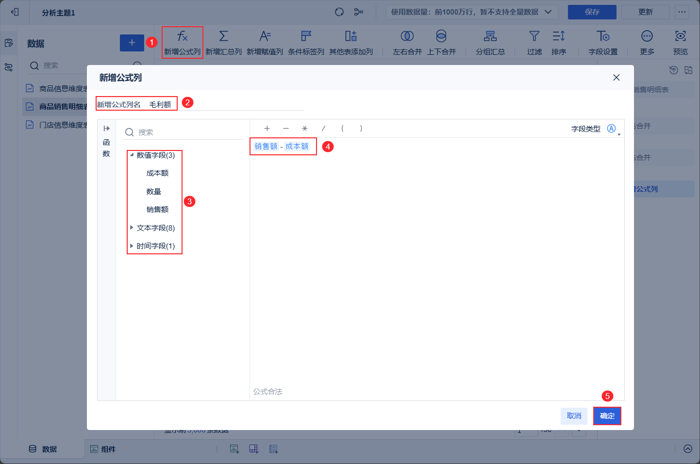 点击「新增公式列」,创建「毛利额」指标,毛利额=销售额-成本额,如下图所示: