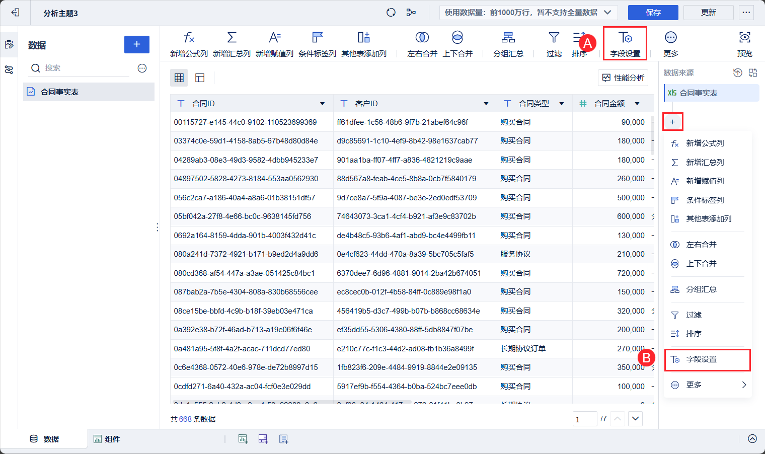 在数据编辑界面,点击「字段设置」,或者点击右侧「+>字段设置」都可以添加步骤。如下图所示: