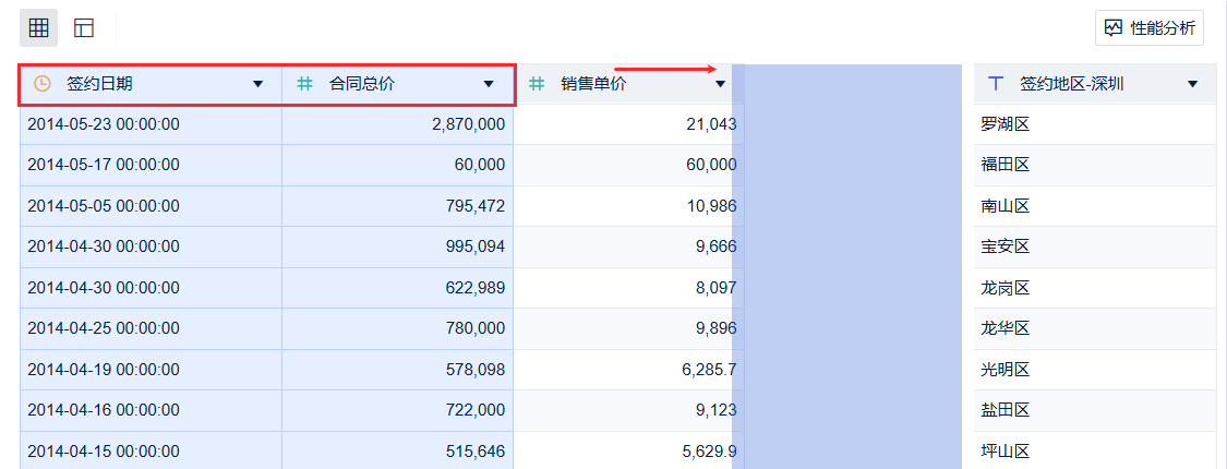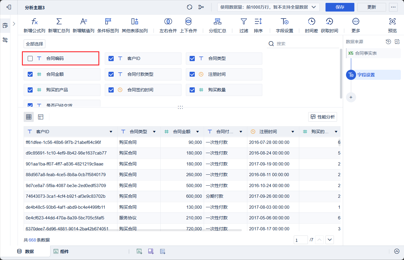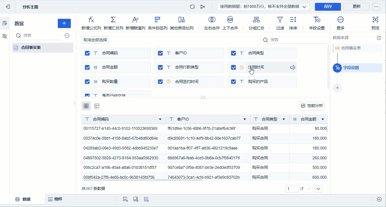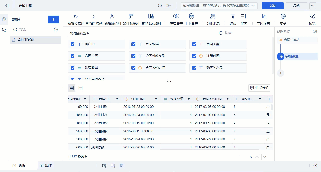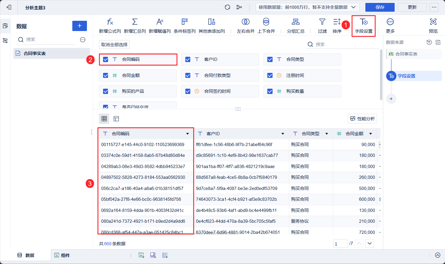 我们使用 FineBI 自带的 demo 数据集「合同事实表」作示例。
