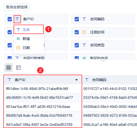 例如,取消勾选「合同编码」字段,预览区域不再显示。如下图所示: