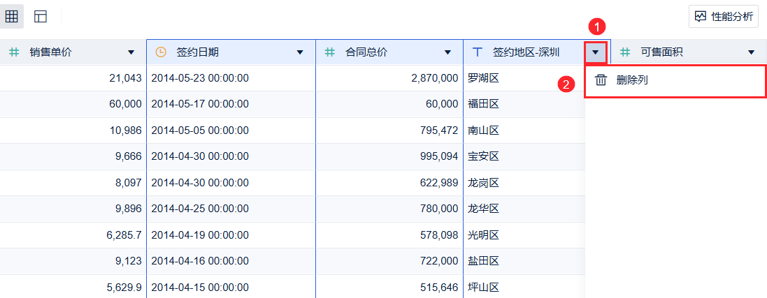 用户可以按住快捷键 ctrl/shift 选择多个表头,点击表头下拉即可删除多列。如下图所示