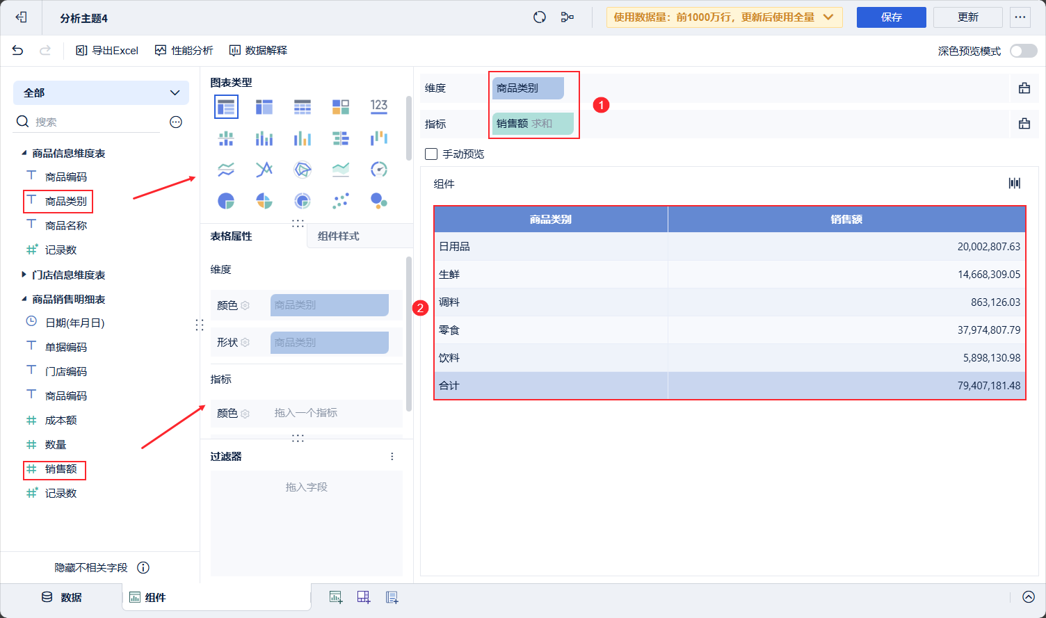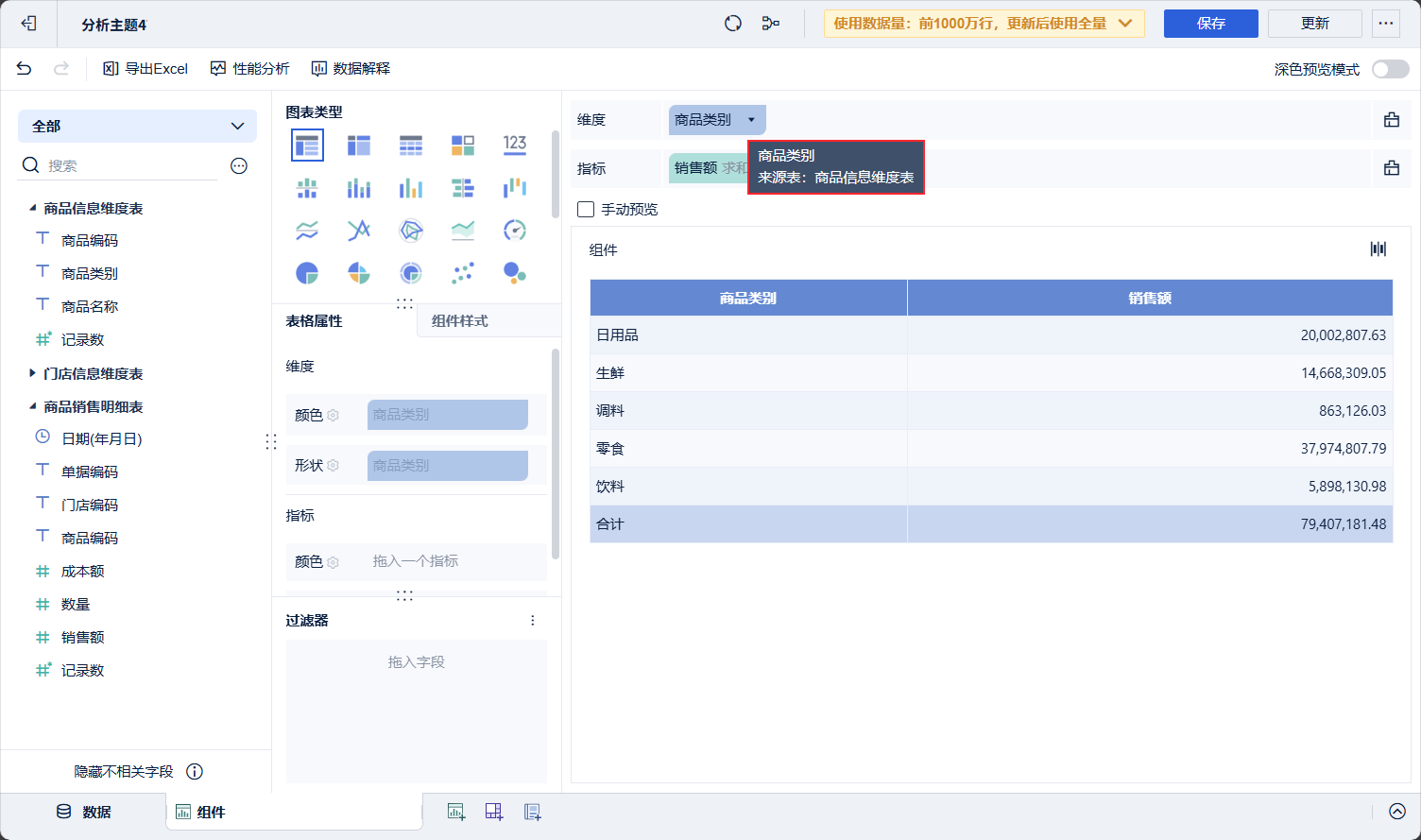 在组件中选择商品信息维度表的「商品类别」,商品销售明细表的「销售额」。拖入分析区域得到不同类别商品销售额情况。如下图所示: